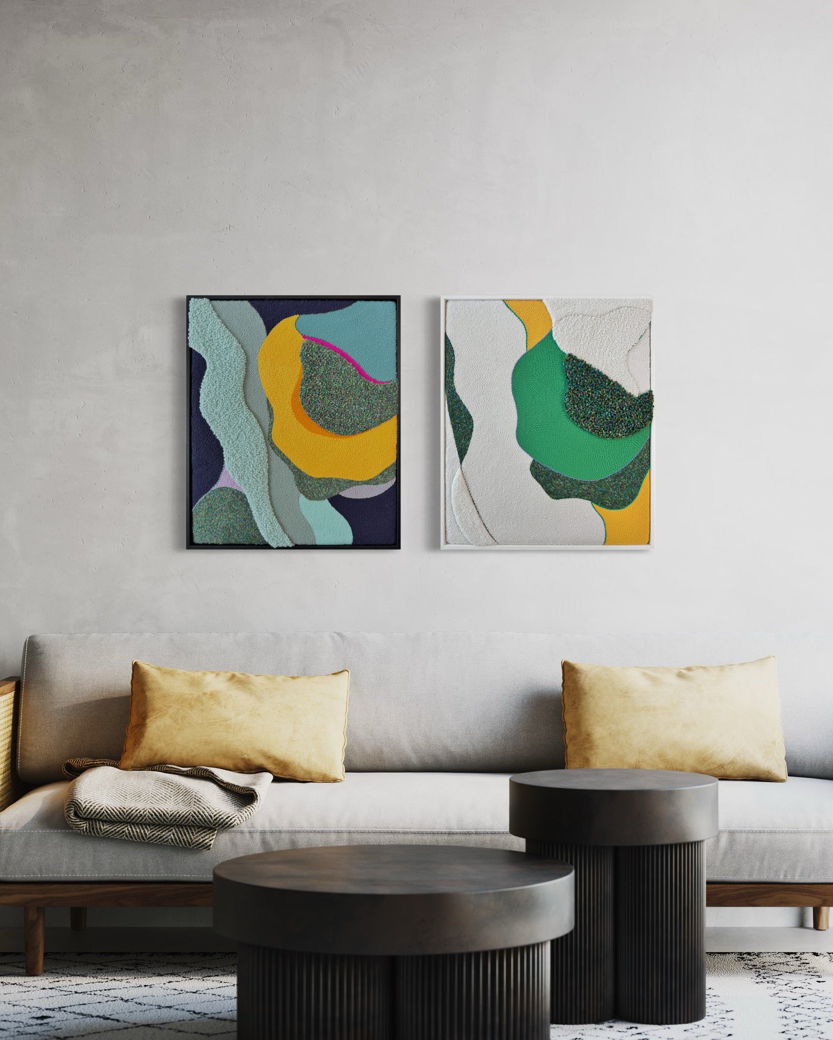 Cette œuvre abstraite réalisée au punch needle a été créée en utilisant une palette de couleurs comprenant le blanc, le vert et le jaune.