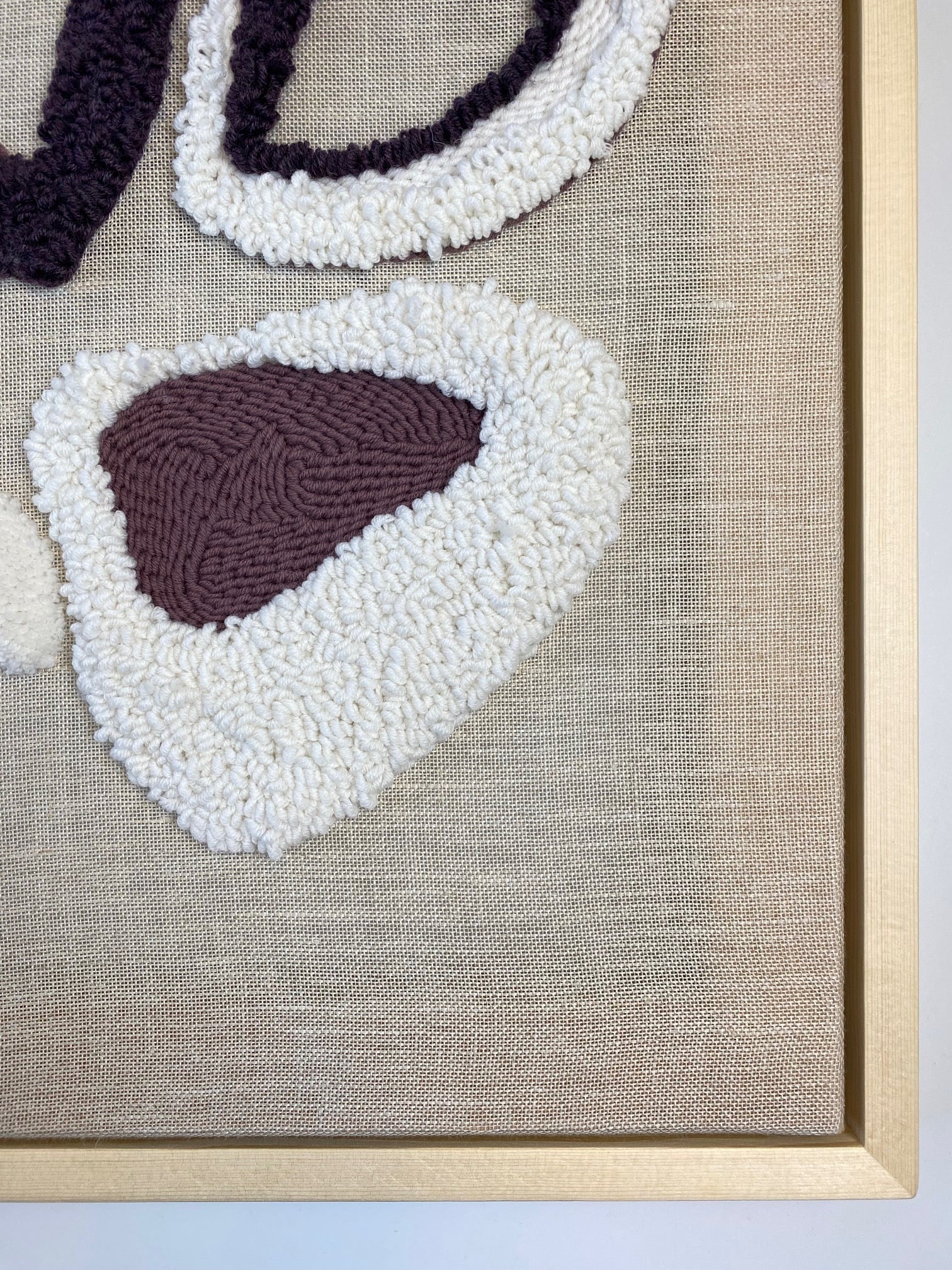 This unique and original artwork has been created using light beige and purple yarn.